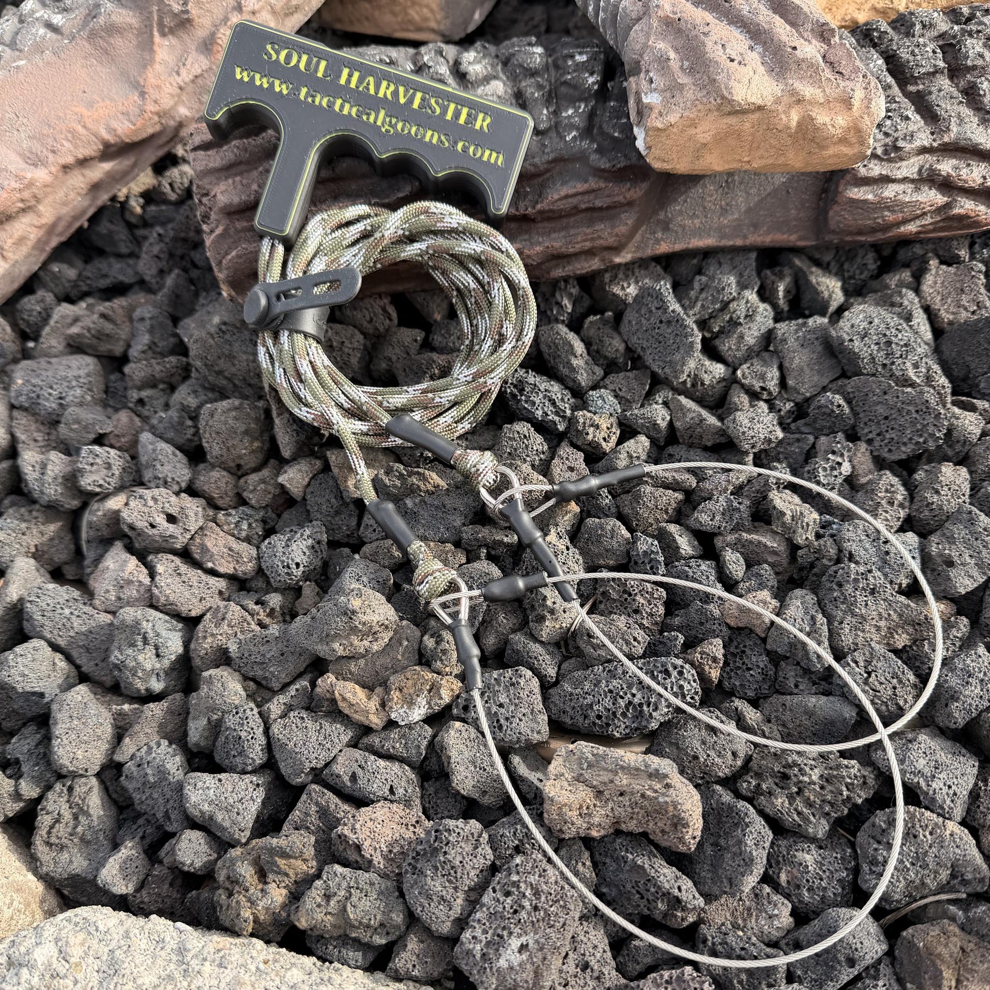 At the core is a rugged, ergonomic 3D-printed T-handle with deep finger grooves, designed for a secure grip with bare hands or gloves. The handle features two independent pull points, each fitted with approximately 4 feet of 550 paracord and a 12-inch stainless steel leader, giving you the flexibility to run a single or dual pull from one compact drag.